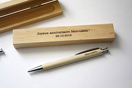 Coffret bois et stylo personnalisé en bois. Personnalisez-le avec le texte de votre choix. Le prix inclue les personnalisations (gravure du stylo et gravure du coffret). Caractéristiques : Stylo à bille en bois et métal couleur argenté. ENCRE BLEUE. Stylo rechargeable avec une mine bille standard (il suffit de dévisser la pointe). Gravure laser. Taille du stylo : 14,2 cm de long. Taille du coffret en bois : 17 cm x 2,5 cm x 2,1 cm. //// COMMENT PERSONNALISER MON STYLO ET MON COFFRET ? Lors de l’achat, indiquez dans les formulaires de commande les textes que vous souhaitez (à droite de votre écran). La police d’écriture sera la même que celle des exemples. Vous pouvez voir l’alphabet dans les images.
